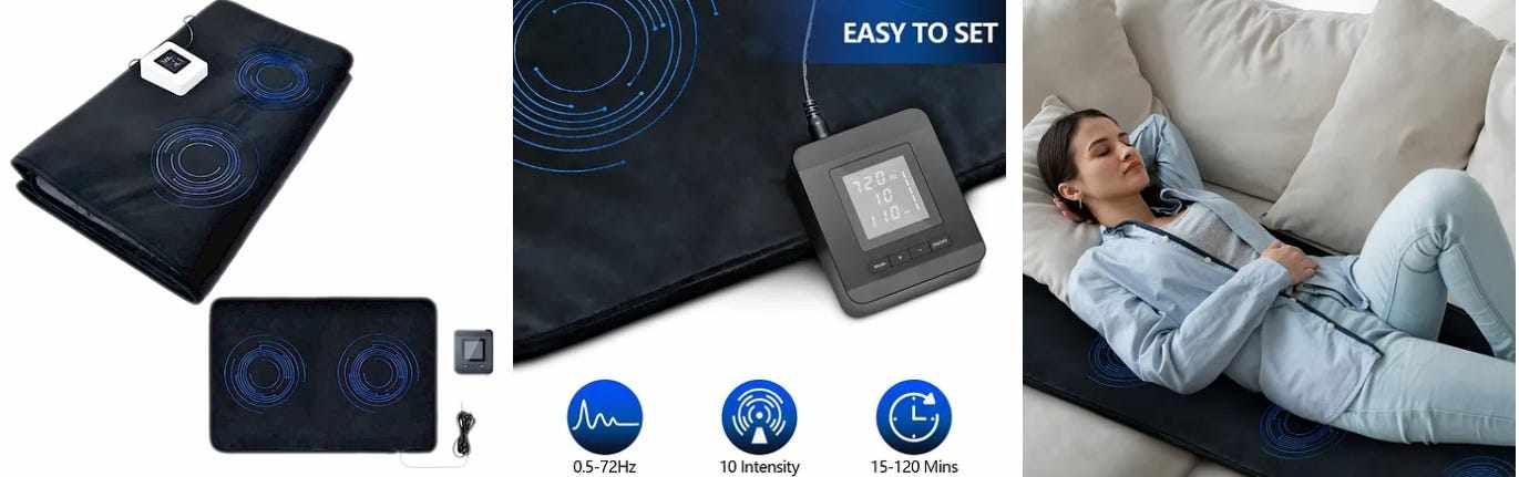 The Hi-Tech PEMF Package by PEMF-devices.com includes a whole-body PEMF mat and a pillow-sized PEMF Pad. The PEMF Mats feature a frequency range is from 0.5 to 72 Hz with adjustable intensity (up to 22 Gauss) and timer. They are simple to use and sturdy yet comfortable with velvet PU leather, which will serve you well for years to come.