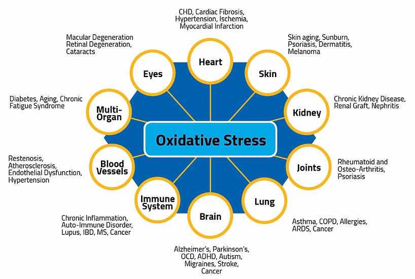 Oxidation also increases when we are physically and/or emotionally stressed. However, as long as we have enough anti-oxidants, a balance is maintained without damage. Oxidative stress happens when free radicals exceed antioxidants. Oxidative stress is essentially an imbalance between free radicals’ production and the body’s ability to counteract or detoxify their harmful effects through neutralization by antioxidants.